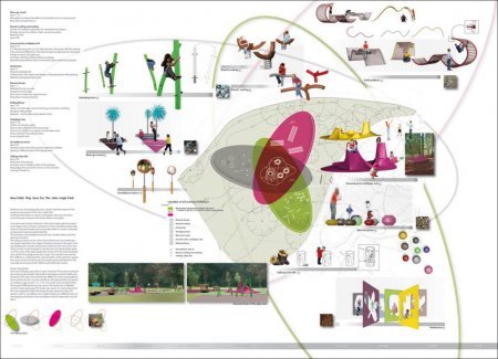 The dialog is based on the colors forms themes etc. Some elements are simply inspired by the shapes of plants growing in the park, some are imitating the natural mechanisms, others are the exact print outs of the chosen corner and gain a new function, by being simply replaced. The colors of the play equipment are found in the park landscape and used for the playground color range. The new kids area teaches the children to understand the natural rhythm of the park, the vegetation cycle, secrets of nature yet encourages great, unlimited fun. The new play area inspires both children and adult park visitors.